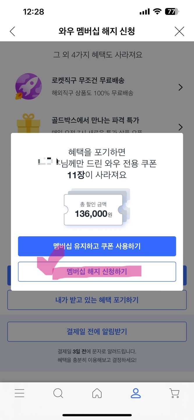 그러면 와우 전용 쿠폰으로 다시 해지를 말리지만 멤버십 해지신청하기를 꾹 눌러줍니다.