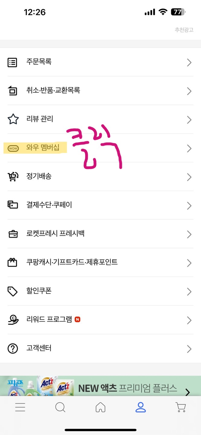 그리고 아래의 홈 버튼 옆에 사람모양 아이콘을 실행시켜 주고 창이 열리면 아래로 내려서 와우 멤버십을 클릭합니다.