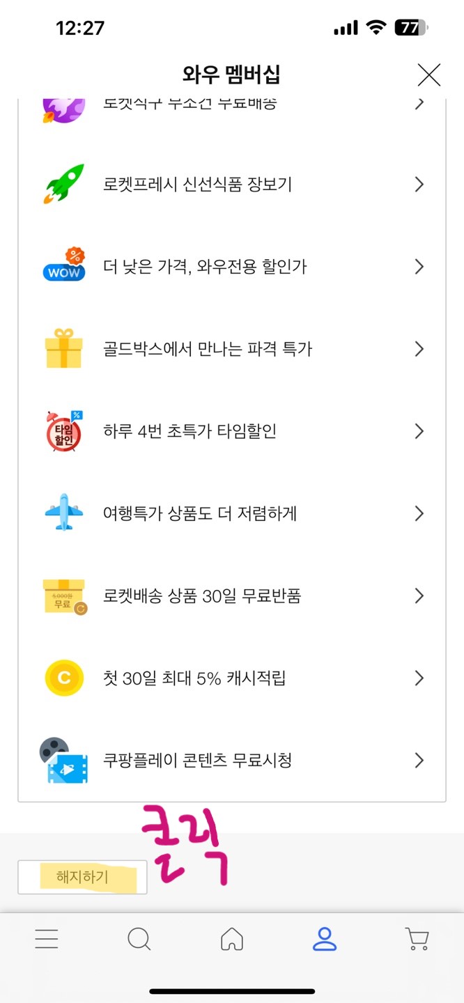 그러면 우리가 와우멤버십으로 누리고 있던 혜택이 나열되며 맨 아래로 내리면 해지하기 버튼이 있습니다.