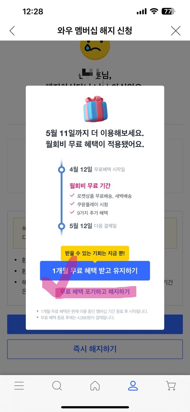 그러면 와우 전용 쿠폰으로 다시 해지를 말리지만 멤버십 해지신청하기를 꾹 눌러줍니다.