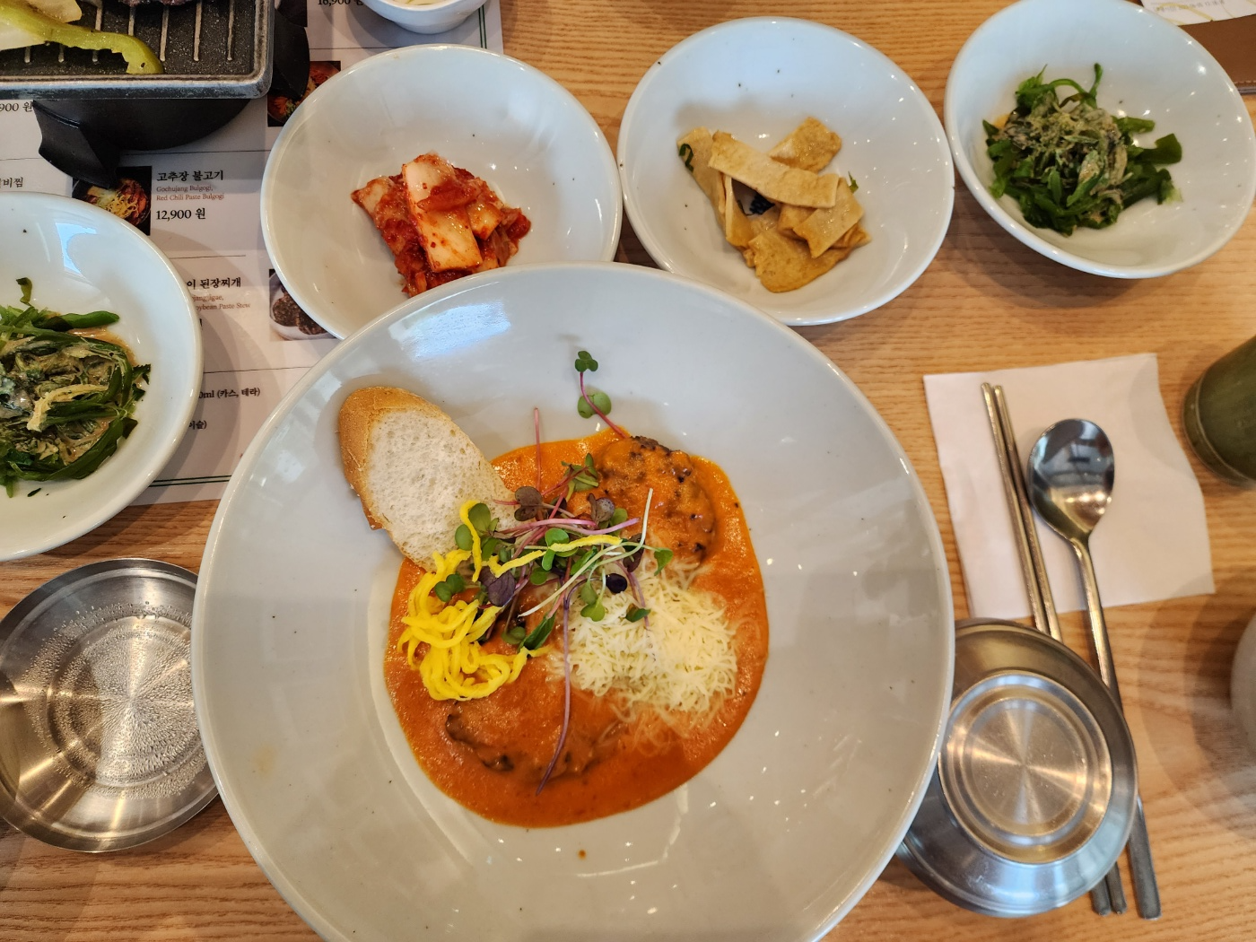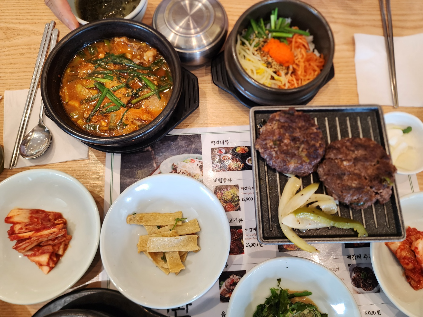 깔끔한 한식 종류의 메뉴가 많은데 저희는 눈꽃치즈 떡갈비 정식, 떡갈비 정식, 뚝배기 소 불고기, 차돌박이 된장찌개를 시켜 먹었습니다. 세팅은 철판 아래 고체연료에 불을 붙여 떡갈비를 계속 따뜻하게 먹을 수 있게 세팅이 되니 식지 않도록 맛있게 먹을 수 있었습니다.