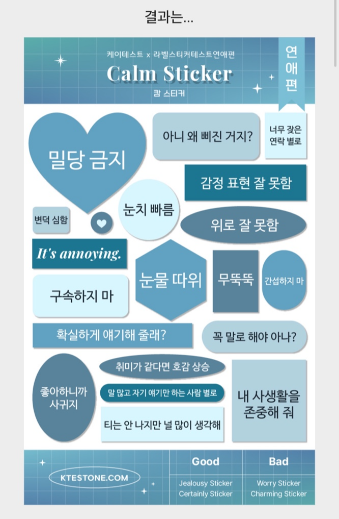 어제 포스팅한 라벨 스티커테스트에 성격편에 이어 오늘은 연애편 테스트가 나와서 또 한 번 해봤습니다. 요즘 스티커 결과가 이쁘고 아기자기한 이 테스트가 한창 인기를 끌고 있는데 생각보다 빠르게 문제를 풀고 결과를 알 수 있기 때문에 좋은 것 같습니다. 게다가 잘 맞는 것 같기도 합니다.