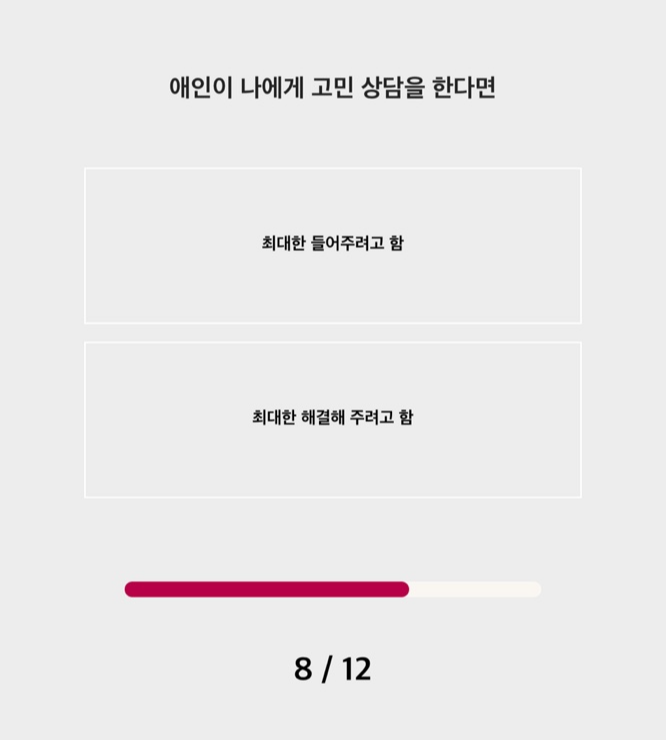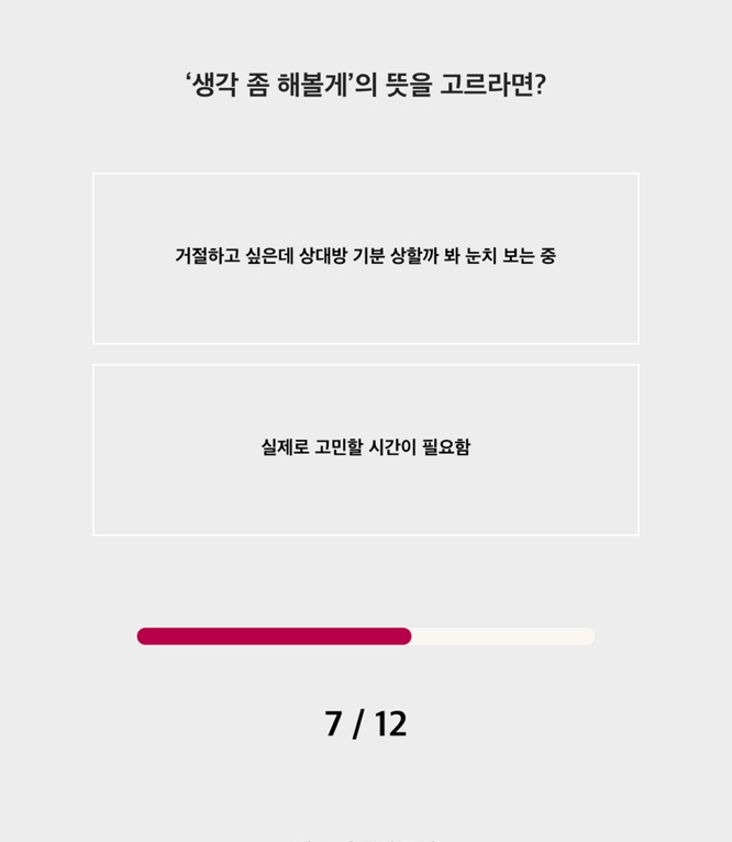 여자친구가 모르는 이성이랑 있을때는 무조건 한 번은 물어보길 참고 먼저 말하길 기다려주는 타입입니다. 그리고 그럴 수 있지는 제가 가장 많이 쓰는 말이라 아예 생각도 안 하고 6번 문항까지 바로 10초도 안 걸렸습니다.