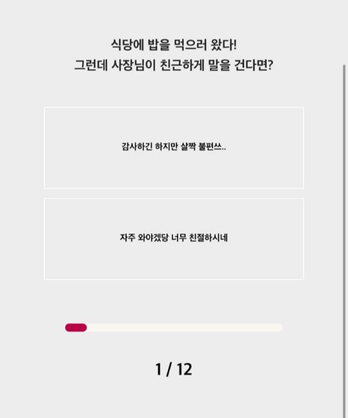 테스트 문항이 총 12개로 선택지 두 개 중 하나만 고르면 되기 때문에 의식의 흐름대로 고르기만 하면 1분도 안 걸리는 테스트입니다. 결과에 따라 스티커 결과지가 달라지며 내 성향에 대한 키워드가 나오니 보는 재미가 있습니다.