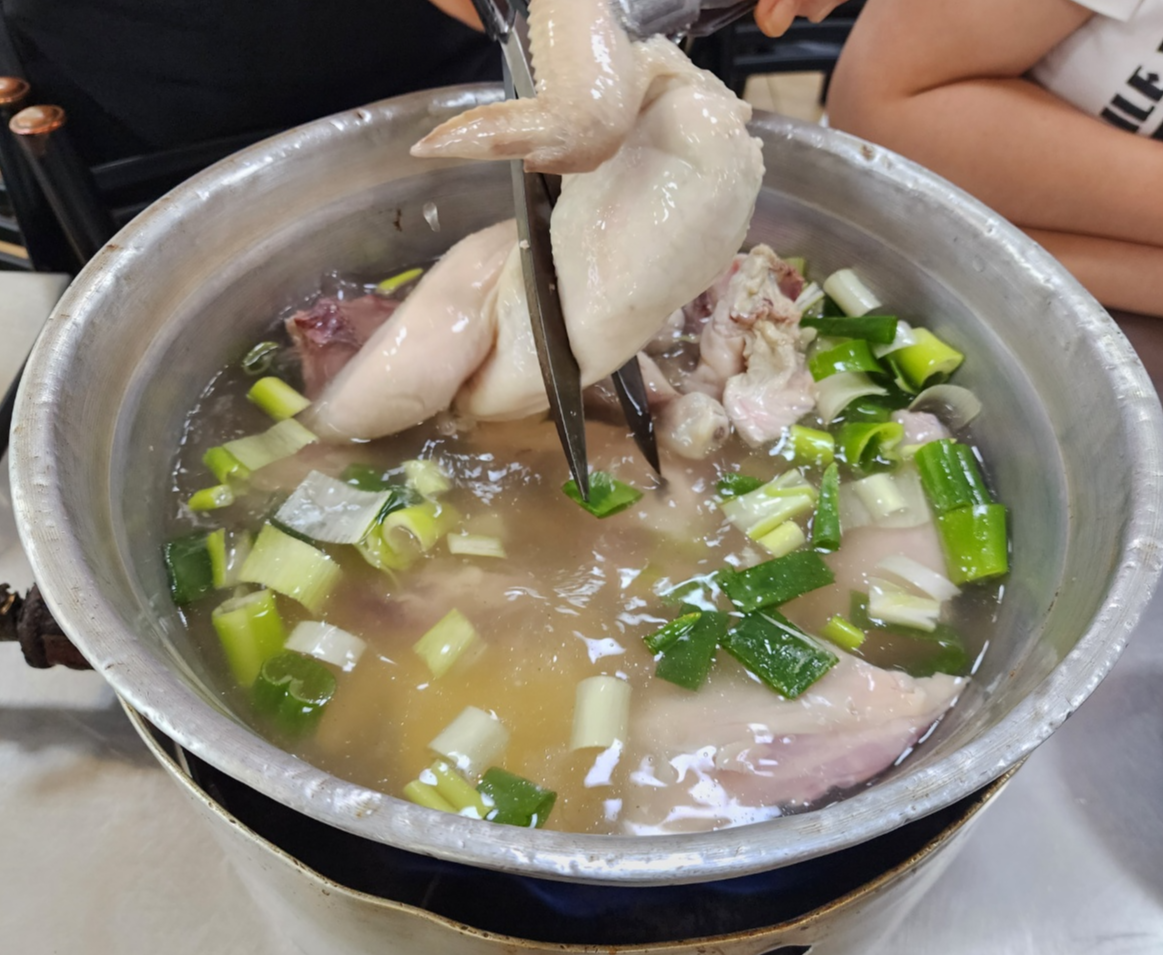 주문을 하면서 동시에 친절한 직원분이 굉장히 빠른 손놀림을 닭한마리를 잘라줍니다. 보시기에 재료가 많이 들어가진 않아 보이지만 육수 자체가 우러나면 굉장히 깊은 맛이 납니다.