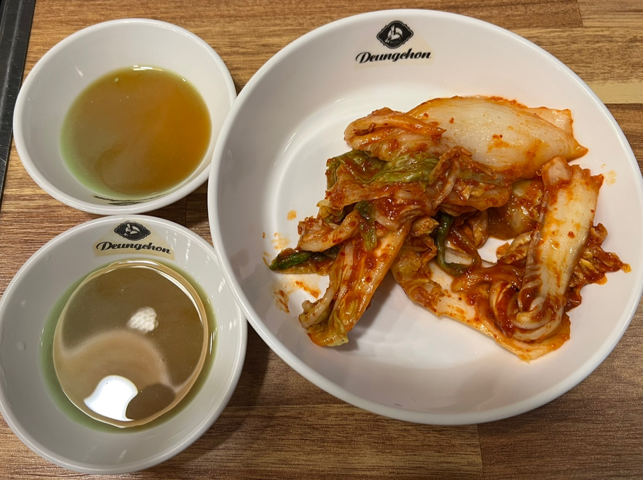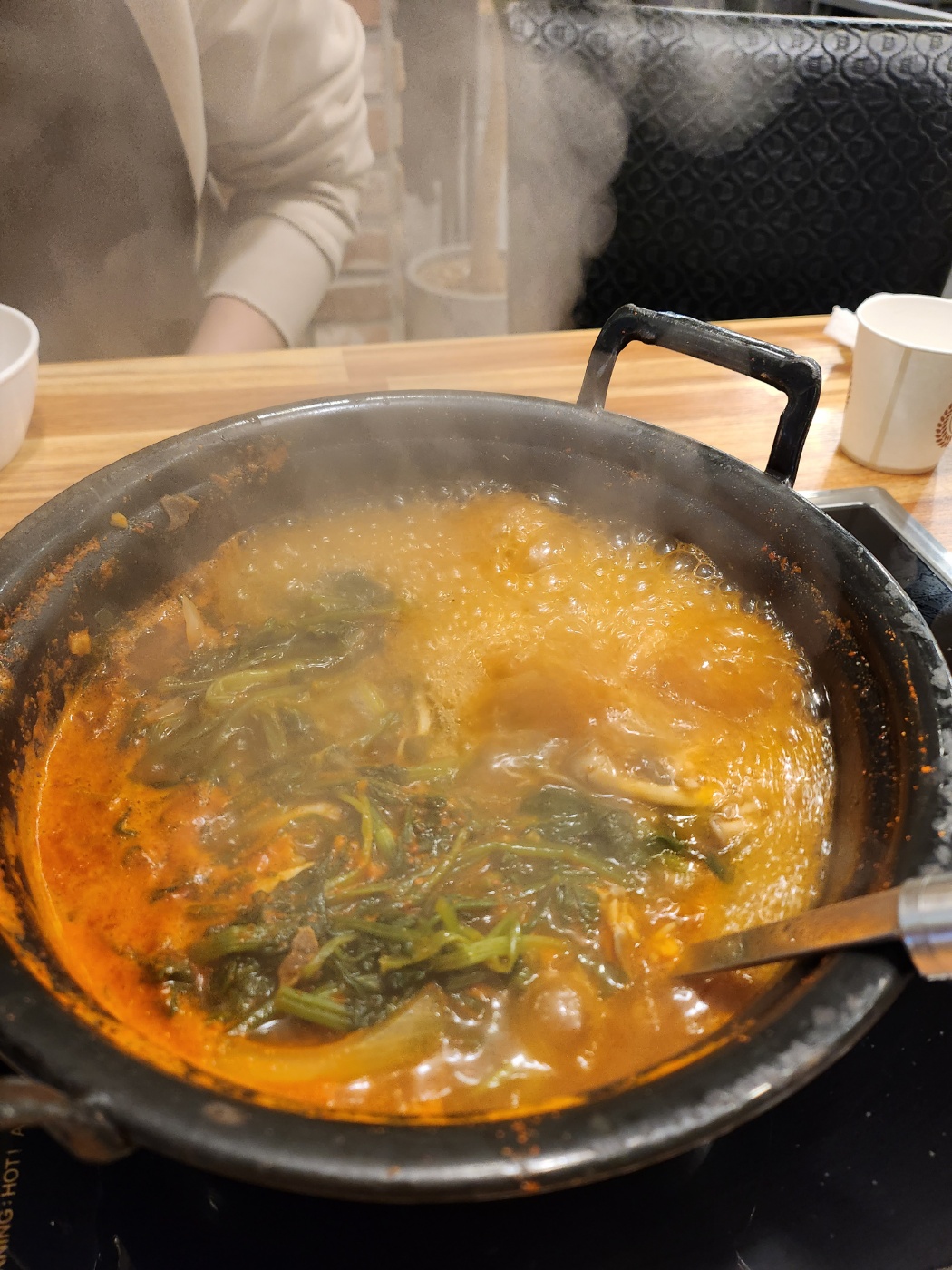 유일한 반찬인 김치는 셀프코너에서 계속 먹을 수 있고 달달한 칼국수집 특유의 김치로 아주 맛있습니다. 주문을 하면 바로 미나리가 올라간 얼큰 칼국수 육수가 나오고 죽과 샤부샤부가 나옵니다. 육수가 끓여지면 고기를 넣어 먹으면 되고 취향에 따라 칼국수를 넣으시면 되겠습니다.