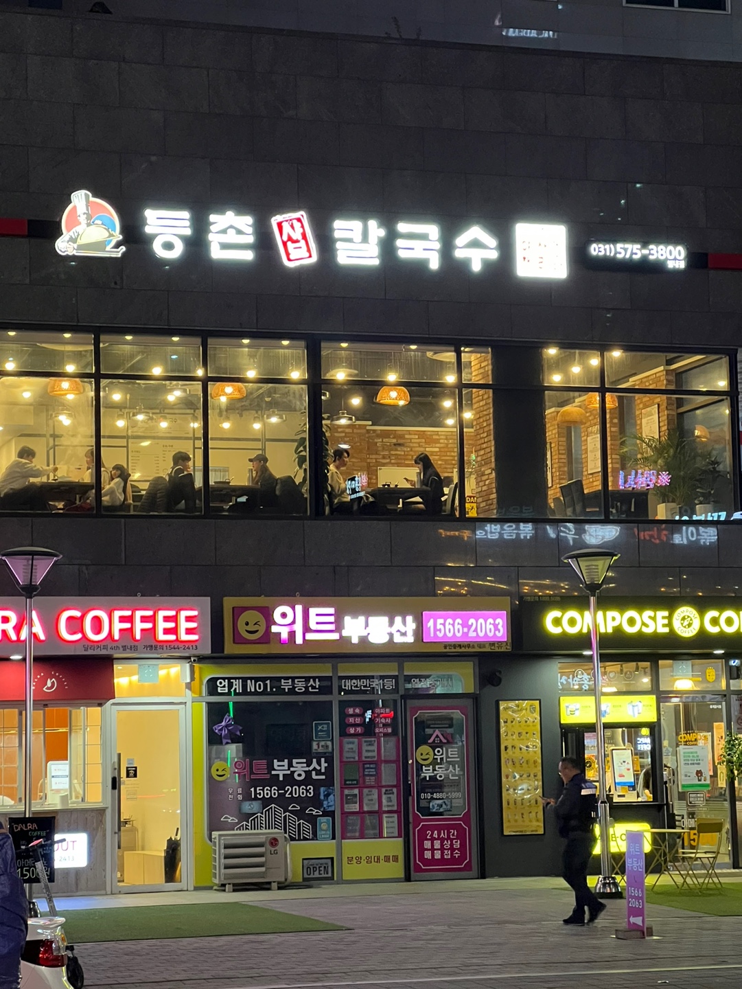 아무튼 주차장에서 맛집을 고르지 못하고 출구로 나오는 길에 등촌칼국수가 앞에 보였습니다. 밖에서 보기에도 굉장히 깔끔하고 깨끗해 보여서 바로 들어갔습니다. 저번주에 실내공사를 끝마쳐서 정말 깨끗해서 쾌적한 저녁을 먹을 수 있었습니다.