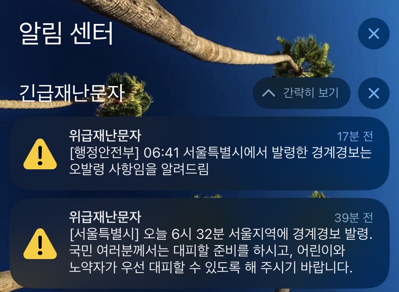 경보가 엄청 크게 울려서 다들 깬 건지 싸이렌이 울리고 동네에서도 방송이 나오고 시끌시끌해서 걱정했는데 오발송이라고 하니 너무 다행이었습니다.