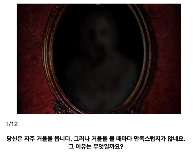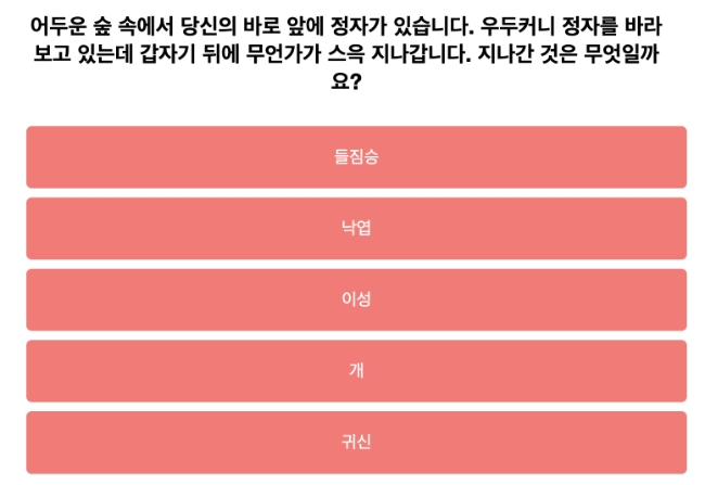 근데 제 생각이 뻔해서 그런지 내 생각이 보기로 안나오면 어쩌라는 거지? 란 생각을 했지만 전부 뻔하게 나왔습니다. 사람들도 전부 그렇게 생각들을 하는 것 같습니다. 총 6문제로 진행되는 이 테스트는 생각보다 빨리 진행을 할 수 있긴 한데 정확한지는 잘 모르겠으나 저는 2~3분 정도 걸린 것 같습니다.