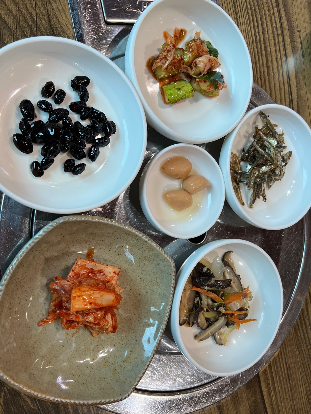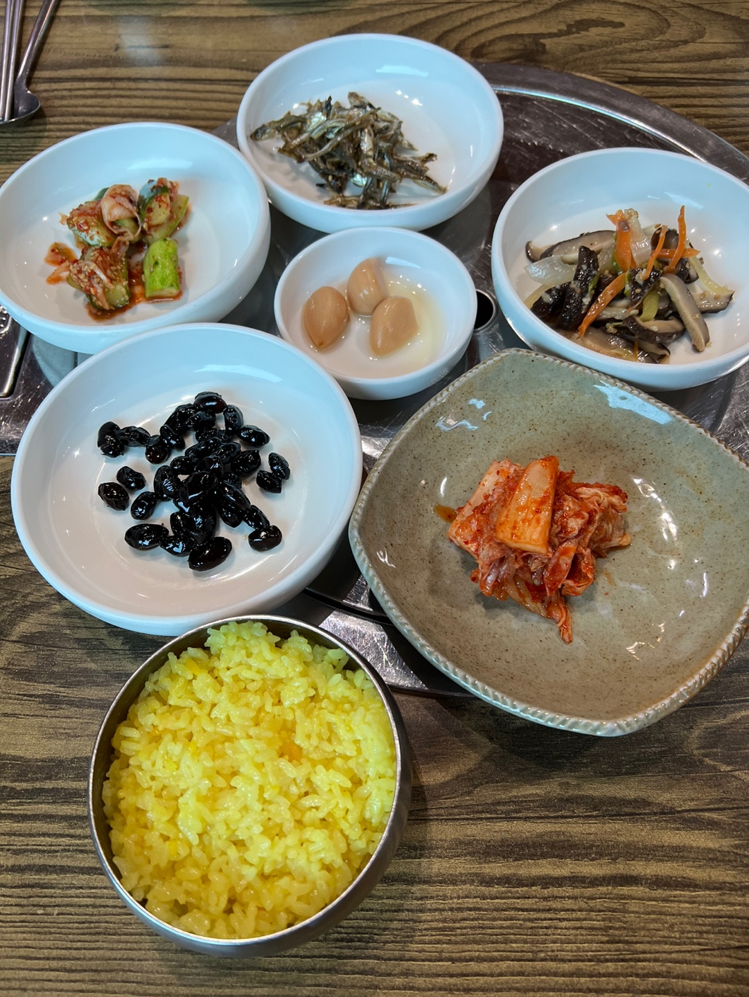 반찬도 계속 봐주시면서 부족하다 싶으면 가져다 주시고 처음에 밥을 먹을 때 공깃밥 뚜껑을 열어보니 노란색 밥이 가득하길래 놀랐었는데 강황밥이라고 합니다. 심장건강과 인지력향상에 도움이 되는 강황을 밥으로 먹으니 색다르고 좀 더 고소한 맛이 나는 게 된장찌개랑 궁합이 잘 맞았습니다.