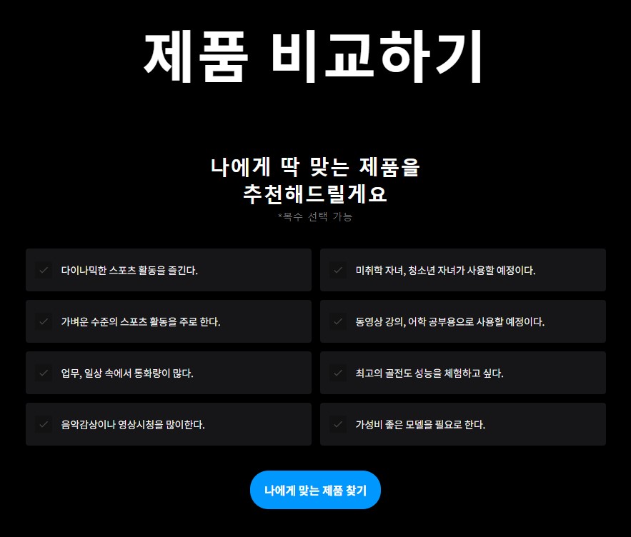 제품을 고민하고 있으시다면 샥즈 홈페이지에서 본인에게 맞는 모델을 추천해주고 있으니 꼭 확인하시길 바랍니다.