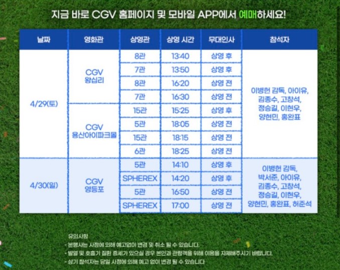 CGV, 메가박스, 롯데시네마에서의 무대인사 일정은 모두 이번주 주말 29일과 30일에 몰려있습니다.