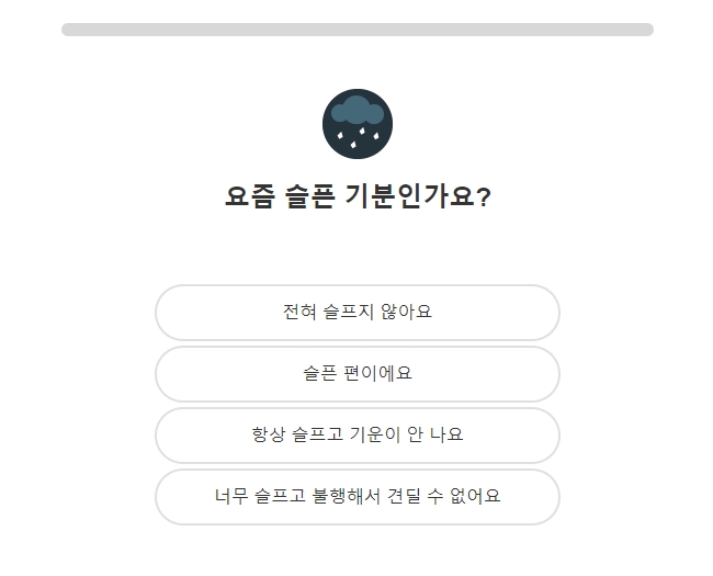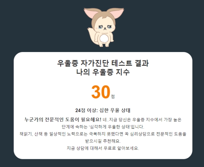 24점 이상이면 심한 우울증 상태라고 하는데 요즘 제 심경대로 문항을 풀고 제출하니 30점이 나왔습니다. 전문적인 도움이 필요한 단계라고 하긴 하는데 사실 우울함을 느낄 때는 많았지만 그렇게 심한 편이라 생각은 안 했는데 신경을 안 쓴다고 해도 은근히 신경이 쓰이긴 합니다.