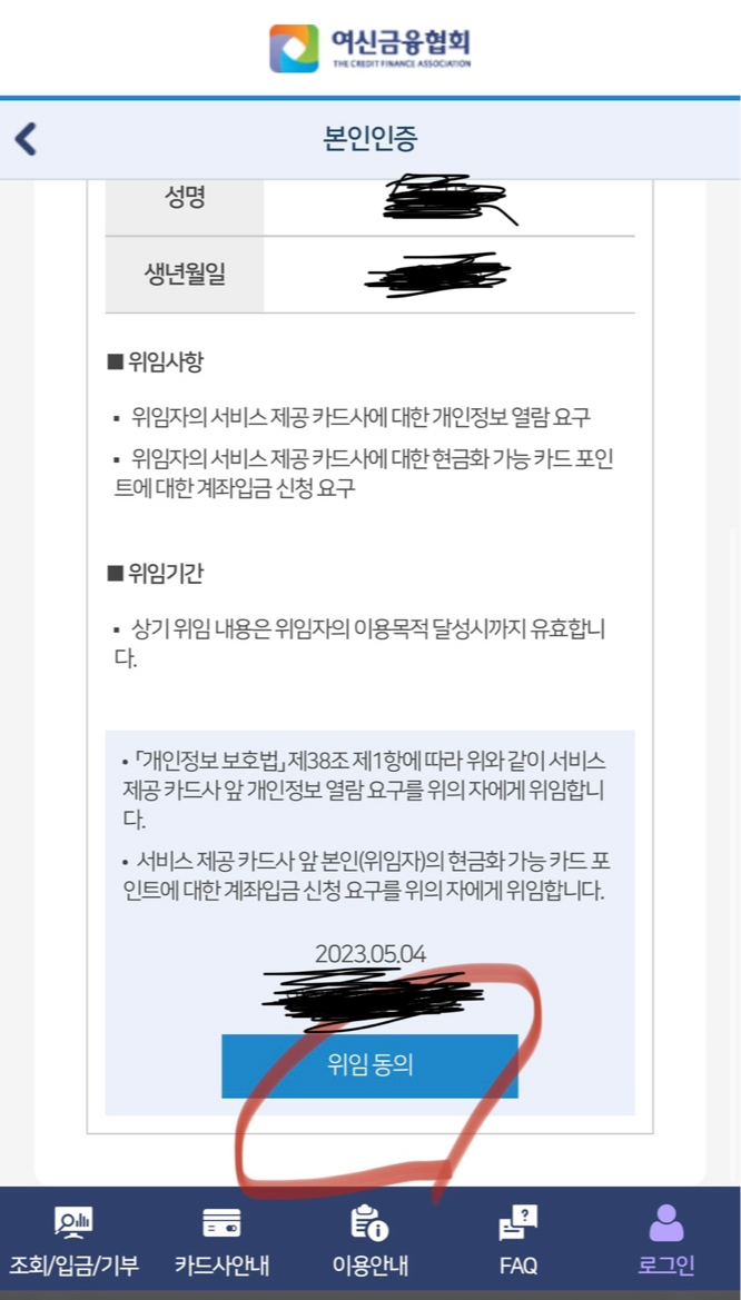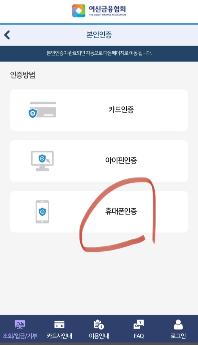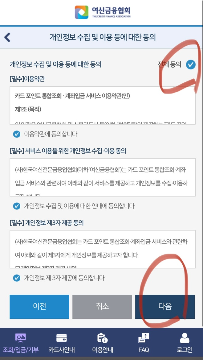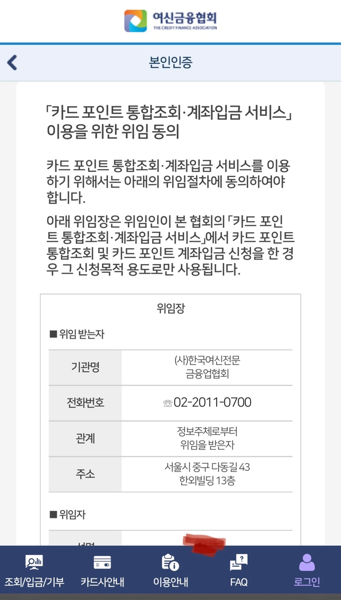 카드포인트 통합조회를 클릭 하시고 비회원 조회하기를 들어갑니다. 그럼 정보 수집 동의에 체크를 하시고 다음을 눌러주시면 본인 인증을 하라는 창이 나옵니다. 이건 편하신 대로 하면 되고 저는 휴대폰인증이 가장 편해서 휴대폰으로 진행했습니다.