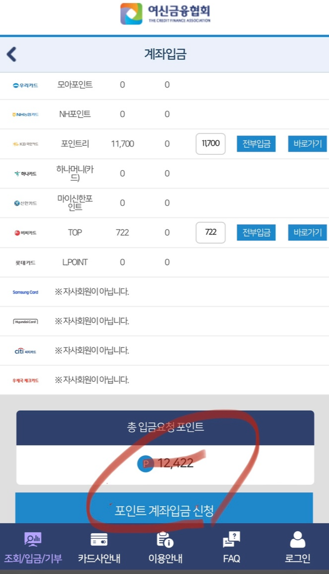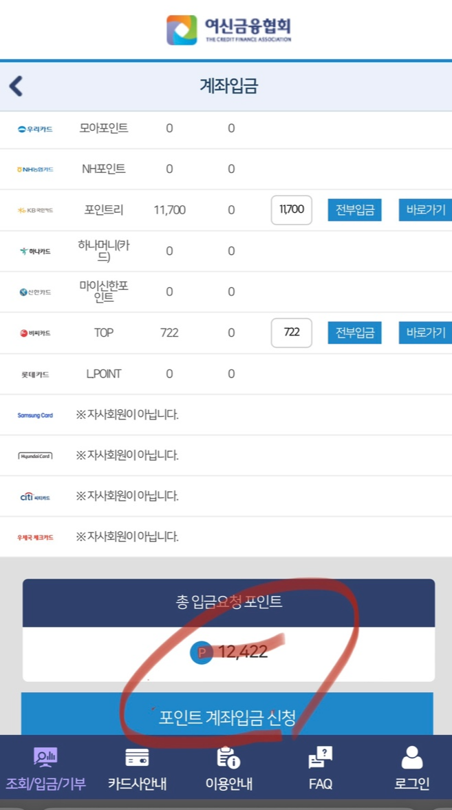 본인인증 다하고 위임동의를 하시면 카드포인트 통합조회 화면이 뜨는데 카드를 고를 수도 있지만 아래의 통합조회를 클릭하면 내 명의로 가입된 모든 카드들의 포인트가 나옵니다. 확인 후 옆에 포인트 계좌입금을 누르면 화면처럼 나오는데 전부 입금을 누르면 됩니다.