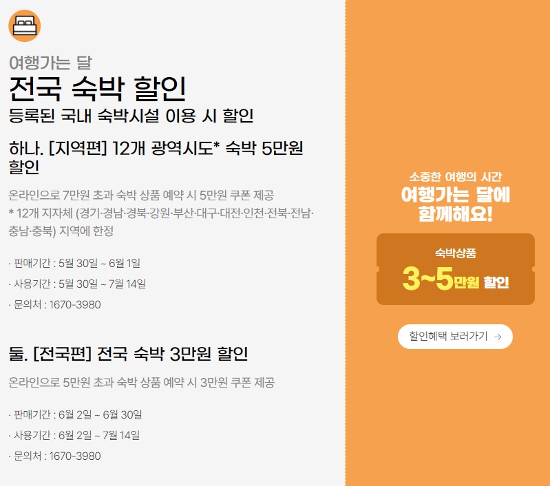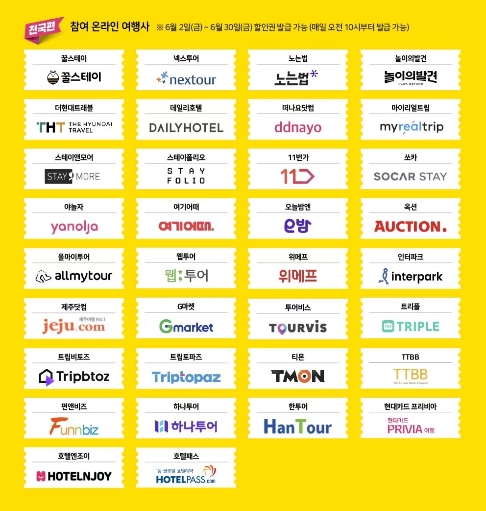 전국편은 5원 초과 숙박 시 3만 원 할인 혜택이 있으며 사용기간은 6월 2일~6월 30일입니다. 그리고 입실 가능 기간은 6월 2일부터 7월 14일로 알고 계시면 되겠습니다.
